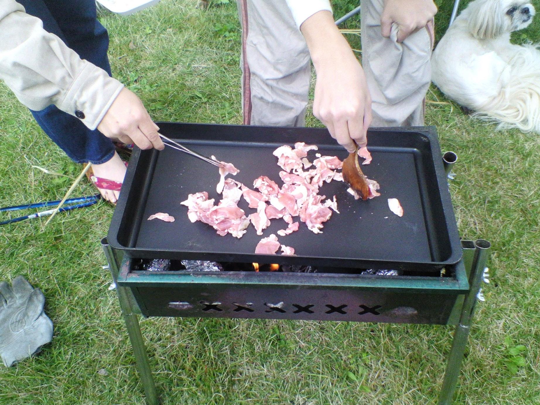 近くのホームセンターで着火材と炭を購入し、肉などの食材をそろえてバーベキューコンロに火を熾し、去年買ったテーブルをローテーブル設定で広げ各自思い思いに椅子を出して焼肉に舌鼓を打った。