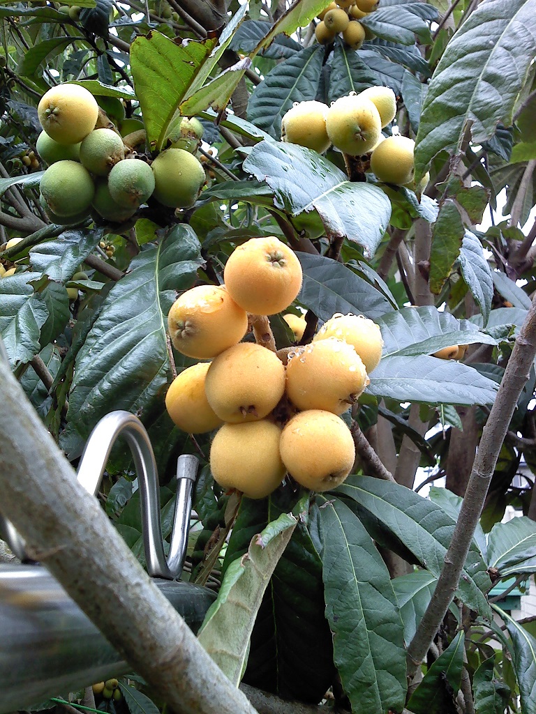 びわは、熟して隣の敷地に落ちるのが嫌だとの妻の強い要望で高く伸びた枝を切り落として日当たりが良くなったからか、いっせいに黄色く色づきはじめたんだ。。