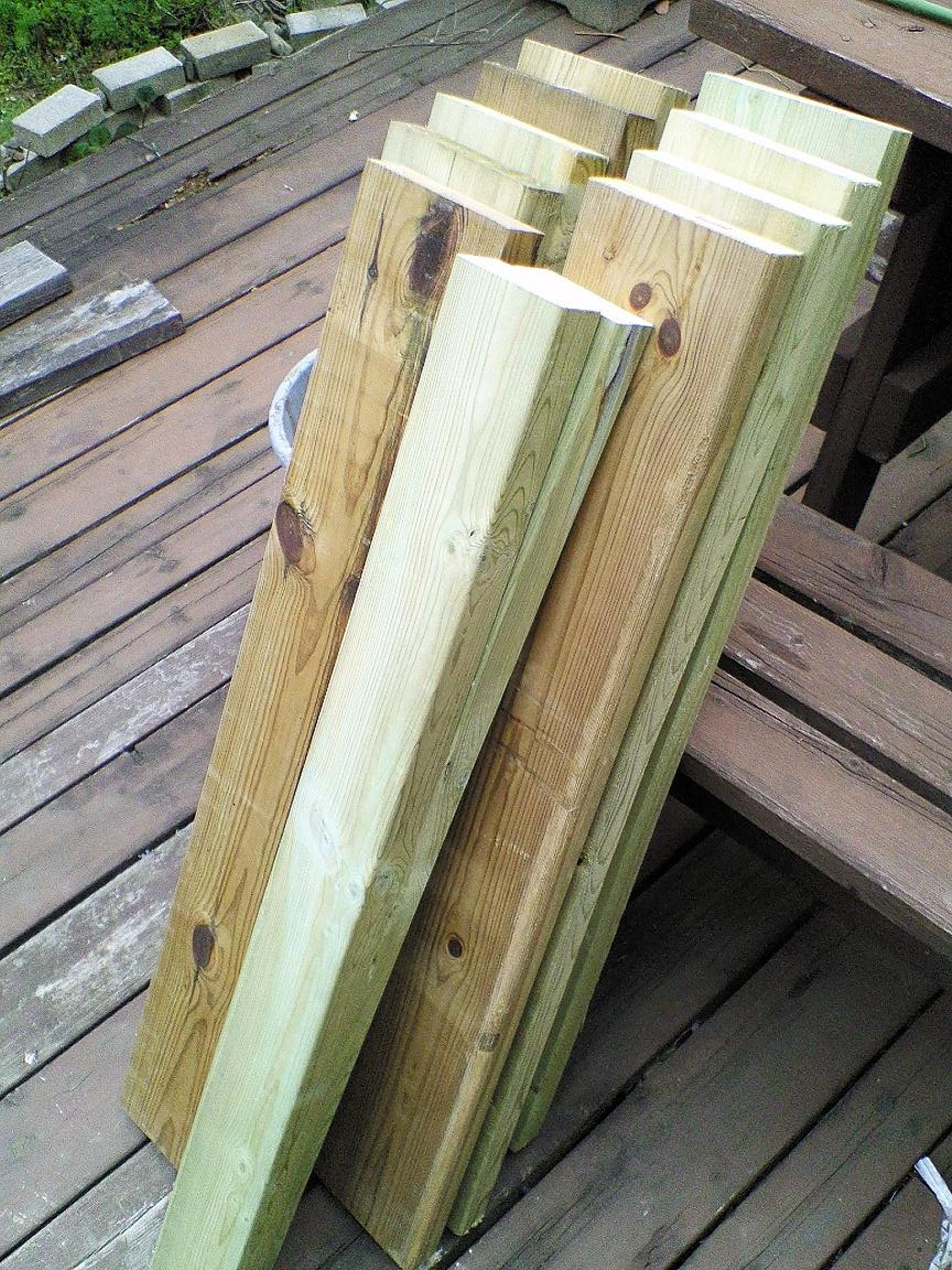 まず、買ってきた木材に防腐、防虫を兼ねたペンキを塗り乾かす間に、朽ちた部分を取り外す。。