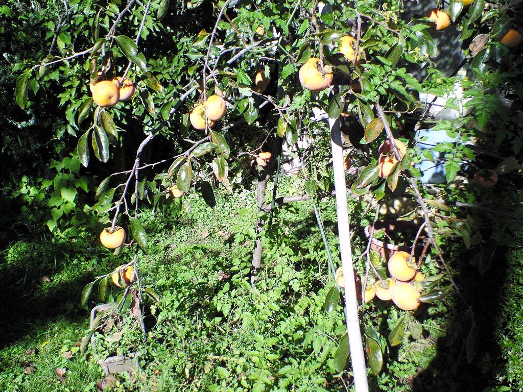 柿が今年もつっかえ棒をしないと枝が折れてしまいそうなくらい沢山実をつけて色付き始めた。。