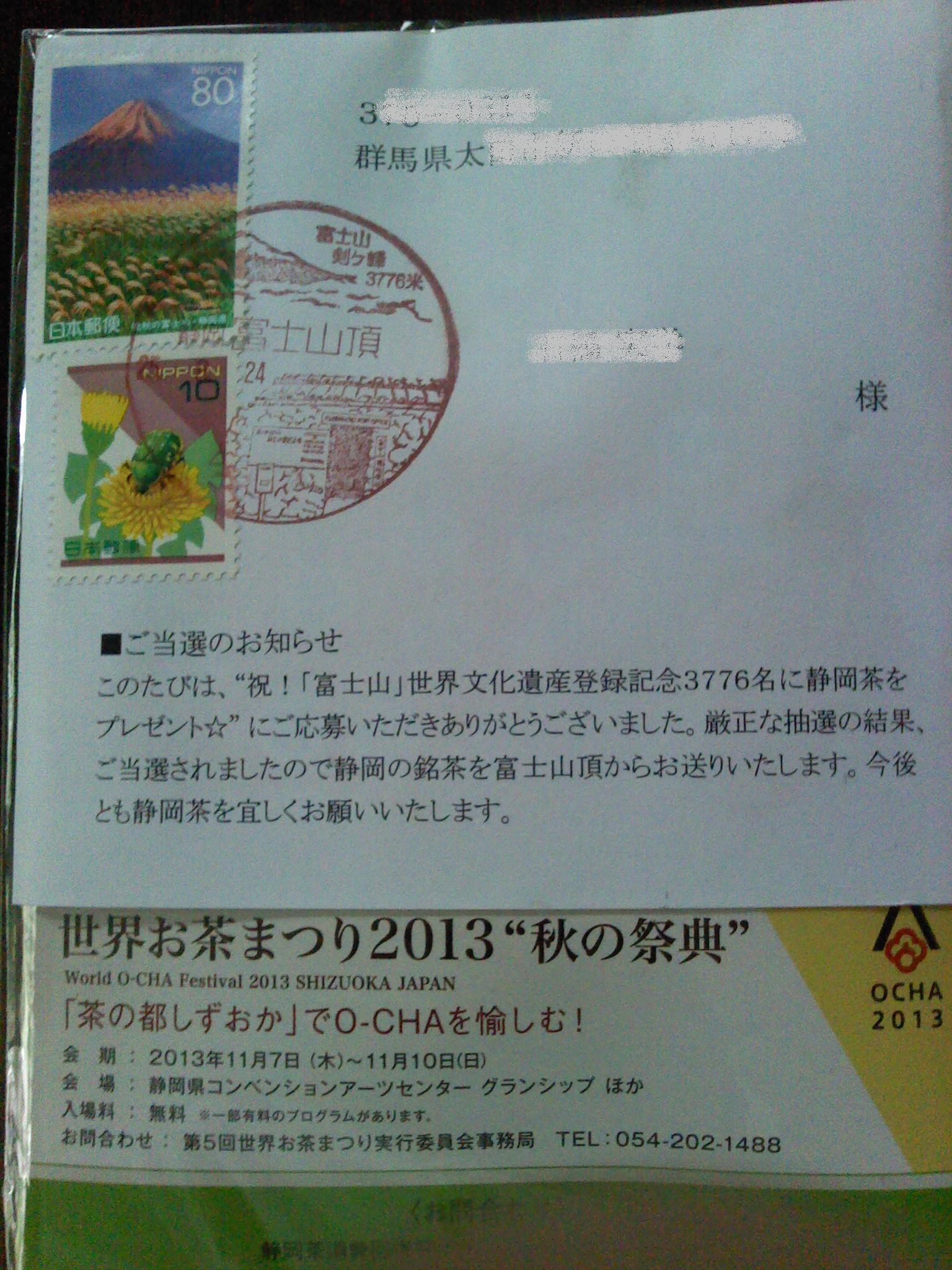 プレゼントに応募したら静岡茶を『富士山山頂からお送りいたします。』だって。。